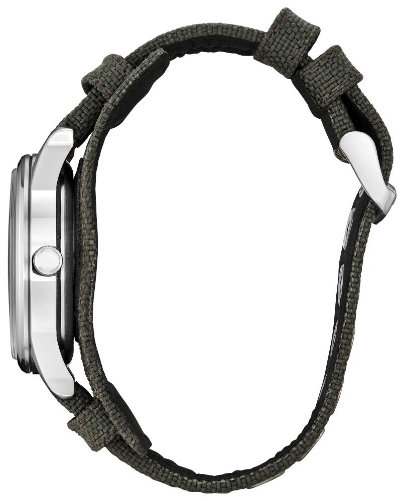 Since 1940, Captain America has served as a shining beacon of liberty and determination. The story of the first Avenger continues to captivate fans worldwide. And just as you’d choose the ultimate patriot to lead your team of Avengers, you’ll want Cap’s rugged new watch on your wrist. The military-inspired black dial with luminous printing and hands features a symbol of his strength—his iconic Vibranium alloy shield—on the sub-dial. The 40mm stainless steel case and dark grey Cordura nylon cuff band are built to last, and the case back showcases the Captain America logo to remind you that freedom is always worth fighting for. Sustainably powered by any light with Eco-Drive technology, this watch never needs a battery. © 2024 MARVEL