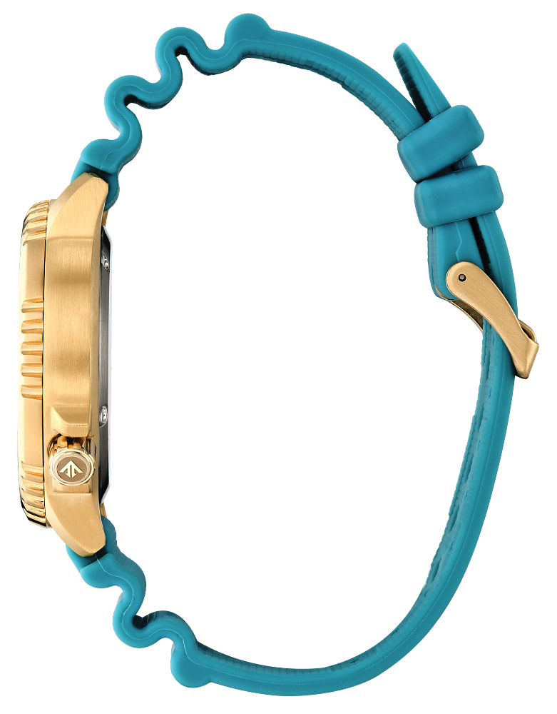 Explore the deepest depths with the latest Promaster Dive in a stylish new colour. This must-have diving watch vibrantly features a gold-tone stainless steel case, a turquoise 3-hand dial with date function, and luminous hands and markers. The durable, matching turquoise polyurethane strap with buckle closure completes the look for a comfortable fit. Featuring our sustainable Eco-Drive technology powered by any light that never needs a battery, you’ll wear this high-performance timepiece in high style from adventures on land to the deep blue sea. ISO compliant and water resistant to 200 metres. Calibre E168.